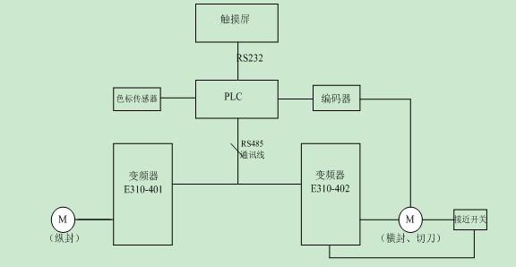 兩臺E310變頻器由一臺PLC通訊控制,縱封由一臺異步電機單獨拖動,橫封和切刀由另一臺異步電機拖動。正常運行時要求兩臺電機保持同步,主運行頻率由PLC給定,以保證袋長的精度。同時,薄膜標記傳感器不斷的在檢測薄膜標記(色標),機械部分的編碼器檢測主軸機械位置,上述兩種信號送至PLC,經程序運算后,如果偏差超過允許值,則由PLC輸出段速信號給控制橫封和切刀的變頻器,段速的切換由接近開關控制,主軸每轉動一圈接近開關導通一次,導通時間占1/3,以時時調整橫封和切刀速度,補償偏差,從而把包裝袋長精確控制在一定范圍內。檢測若在追蹤預定次數后仍不能達到技術要求,可自動停機待檢,避免廢品的產生。
