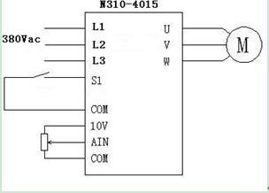 每套設(shè)備使用0.75KW變頻器和11KW變頻器;N310-2001-H1X負(fù)責(zé)拖動牽引電機帶動牽引輥對吹塑好的薄膜進行牽引;N310-4015-H3X負(fù)責(zé)拖動擠出機;牽引電機規(guī)格為0.75KW,50HZ,3.1A,1400RPM,帶有減速機;擠出電機規(guī)格為:380V,11KW,22.6A,1400RPM,50HZ,帶冷卻風(fēng)機,規(guī)格為95W,380V,50HZ,1400RPM;